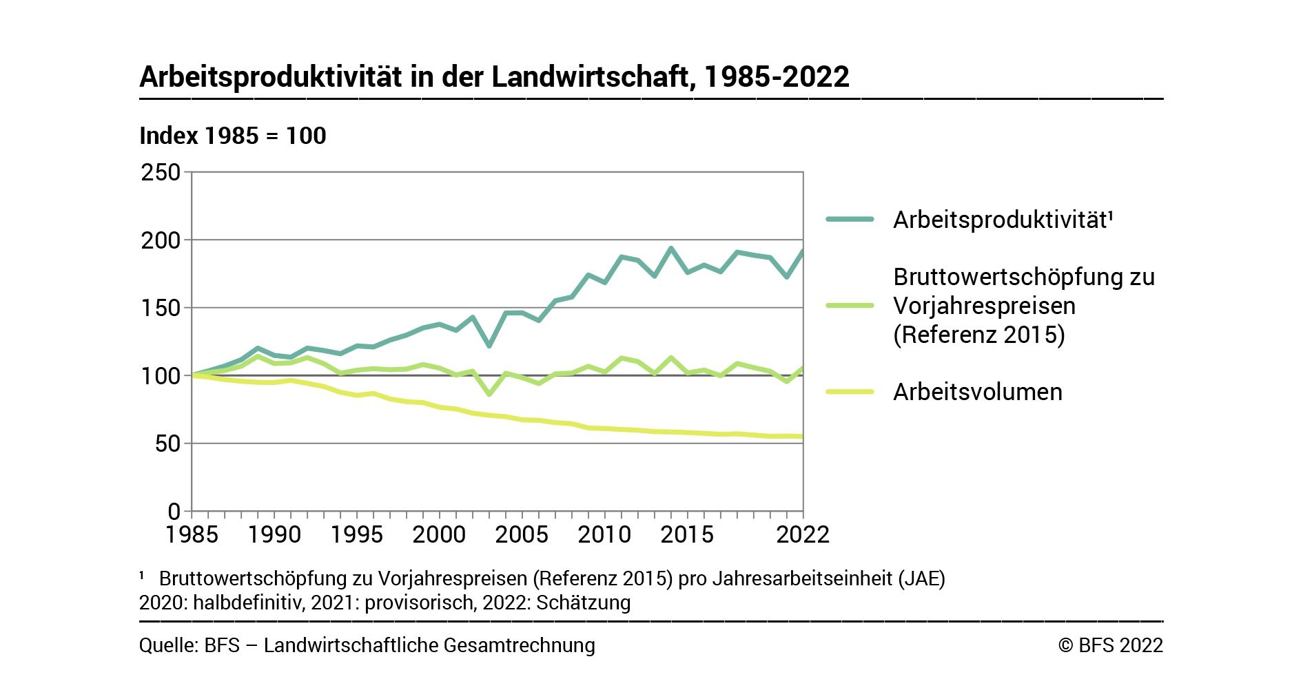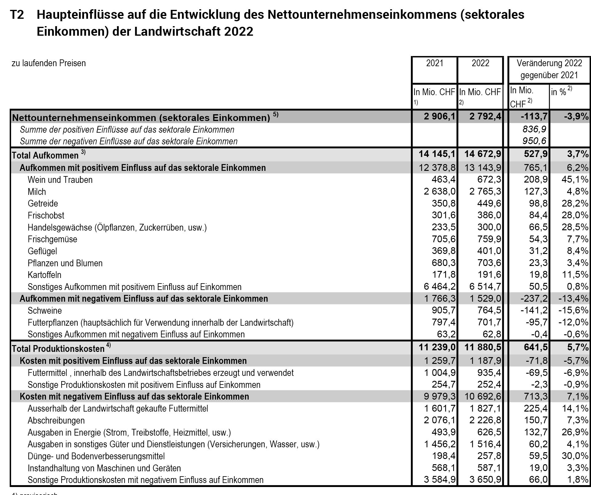 Die wesentlich höheren Abschreibungen (2,2 Mrd. Franken, +7,3%) erklären sich in erster Linie durch den Preisanstieg der Investitionsgüter (Gebäude, Maschinen usw.). Das Arbeitnehmerentgelt (1,4 Mrd. Franken, +0,5%) wird leicht höher geschätzt als 2021, während die Entwicklung der Pachtzinsen (0,5 Mrd. Franken, +2,3%) den Preisanstieg und das Wachstum der gepachteten Landwirtschaftsfläche widerspiegelt.