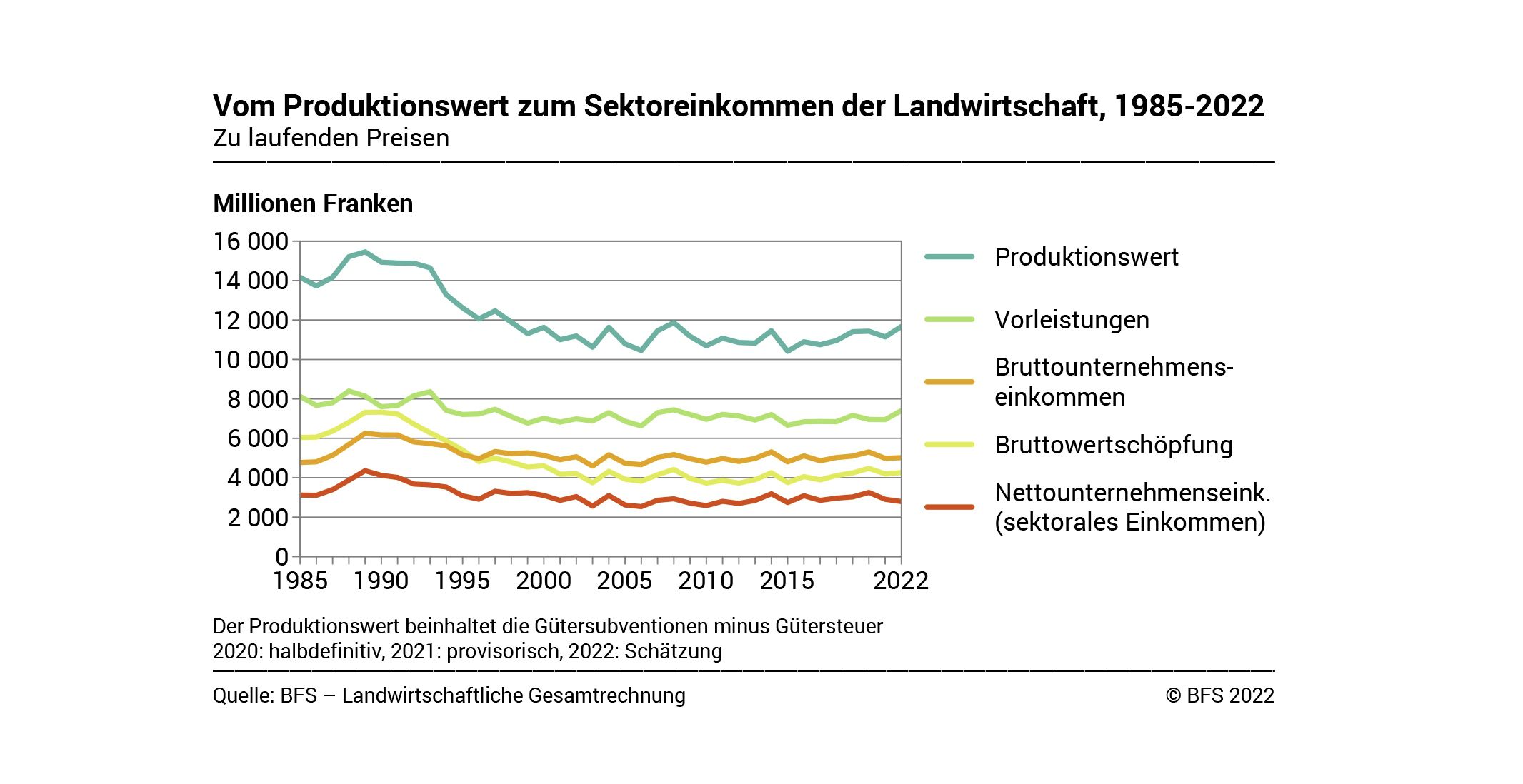 2022 nehmen die Einnahmen (Produktionswert, Staatsbeiträge und Habenzinsen) um 3,7% auf 14,7 Milliarden Franken zu. Die Ausgaben (Vorleistungen, Abschreibungen, Löhne, Pachten, Schuldzinsen und Produktionsabgaben) steigen um 5,7% auf 11,9 Milliarden Franken. Der Saldo, d.h. das Nettounternehmenseinkommen der Schweizer Landwirtschaft, genannt sektorales Einkommen, wird für 2022 auf 2,8 Milliarden Franken geschätzt.