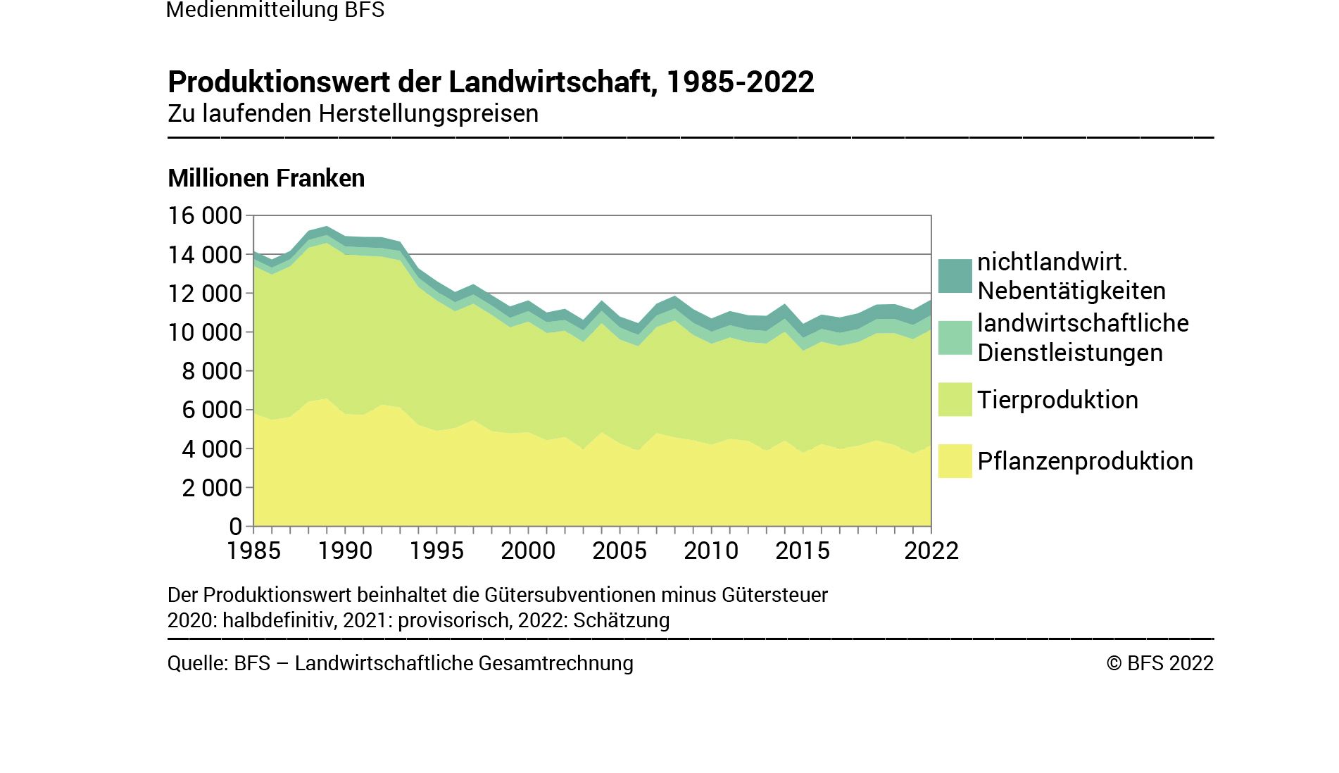 Gemäss ersten Schätzungen wird sich die Gesamtproduktion der Schweizer Landwirtschaft im Jahr 2022 auf nahezu 11,7 Milliarden Franken belaufen. Das entspricht einem Anstieg von 4,7% gegenüber 2021. Die Ausgaben für Vorleistungen (Futtermittel, Energie, Dünger, Unterhalt und Reparaturen usw.) betragen 7,4 Milliarden Franken und sind 6,6% höher als im Vorjahr.