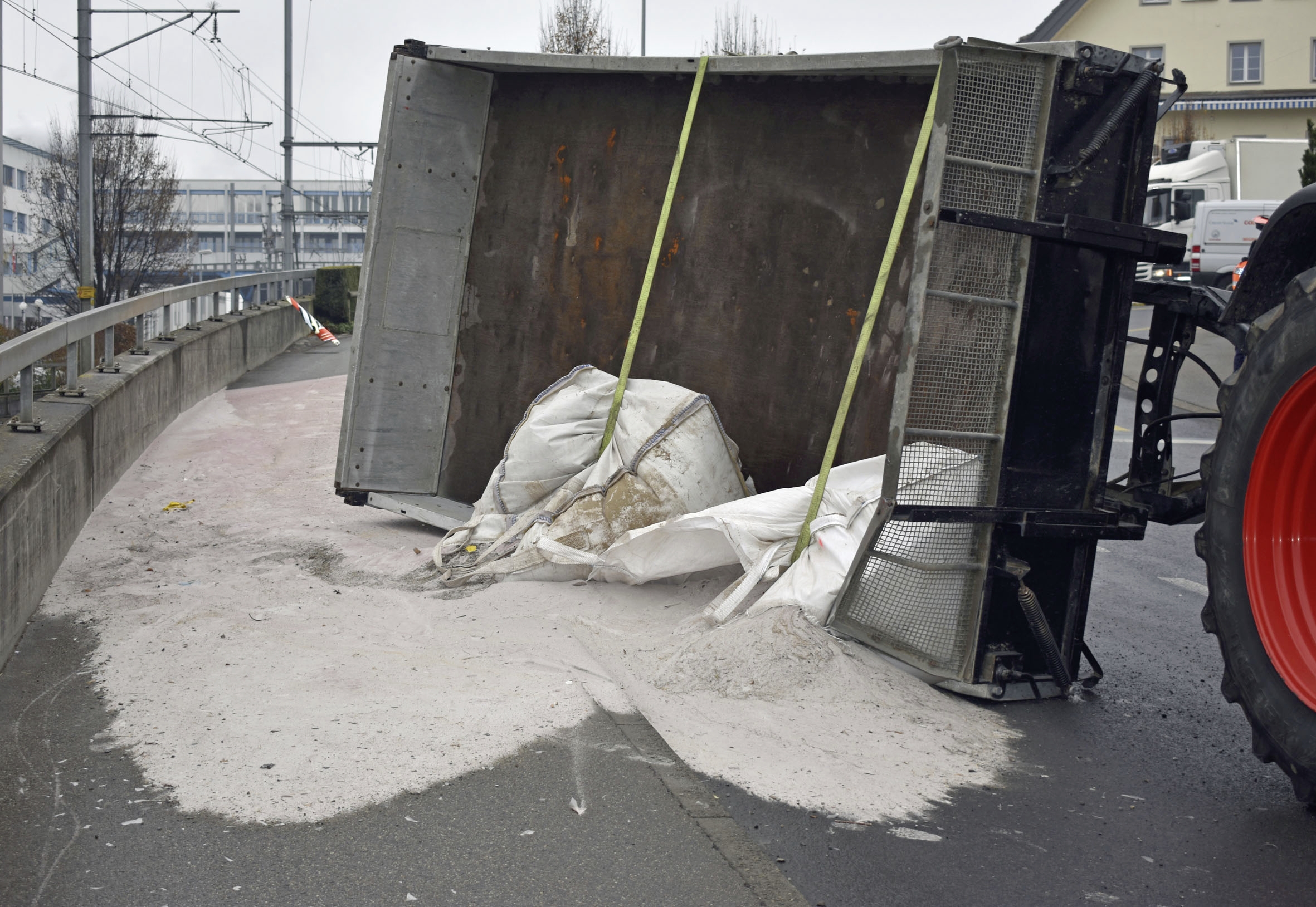 In einer Linkskurve kippte der Anhänger aus noch unbekannten Gründen auf die Seite. Die Ladung, rund 3 Tonnen Granatsand, landete auf der Strasse und dem Trottoir.
