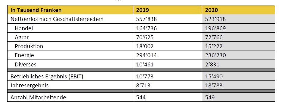Die verkauften Mengen Mischfutter lagen mit -0.6 Prozent praktisch auf Vorjahresniveau. Die verkaufte Menge Dünger konnte um 9 Prozent gesteigert werden. In allen drei Kategorien Saatgut, Sämereien und Pflanzenschutz resultiert eine leichte Umsatzsteigerung. Im Segment Agrar ist 2020 der Umsatz um 2 Millionen auf 72 Millionen Franken gestiegen. Im Segment Produktion ist der Umsatz im Vergleich zum Vorjahr um 2,8 Millionen 15,2 Millionen Franken gesunken. Der Rückgang wird auf die Einschränkungen im Gastro-Kanal zurückgeführt.