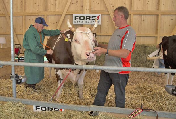 Praktisch gleichzeitig treffen die nächsten drei Rinder, das Fohlen von Hansueli Beer und Siegermuni Fors vo dr Lueg ein. Für Hans Bichsel, dem Halter des Swiss Fleckvieh Stiers ist es ein emotionaler Moment. «Drei Jahre haben wir immer wieder über diesen Tag gesprochen und jetzt ist er da.»