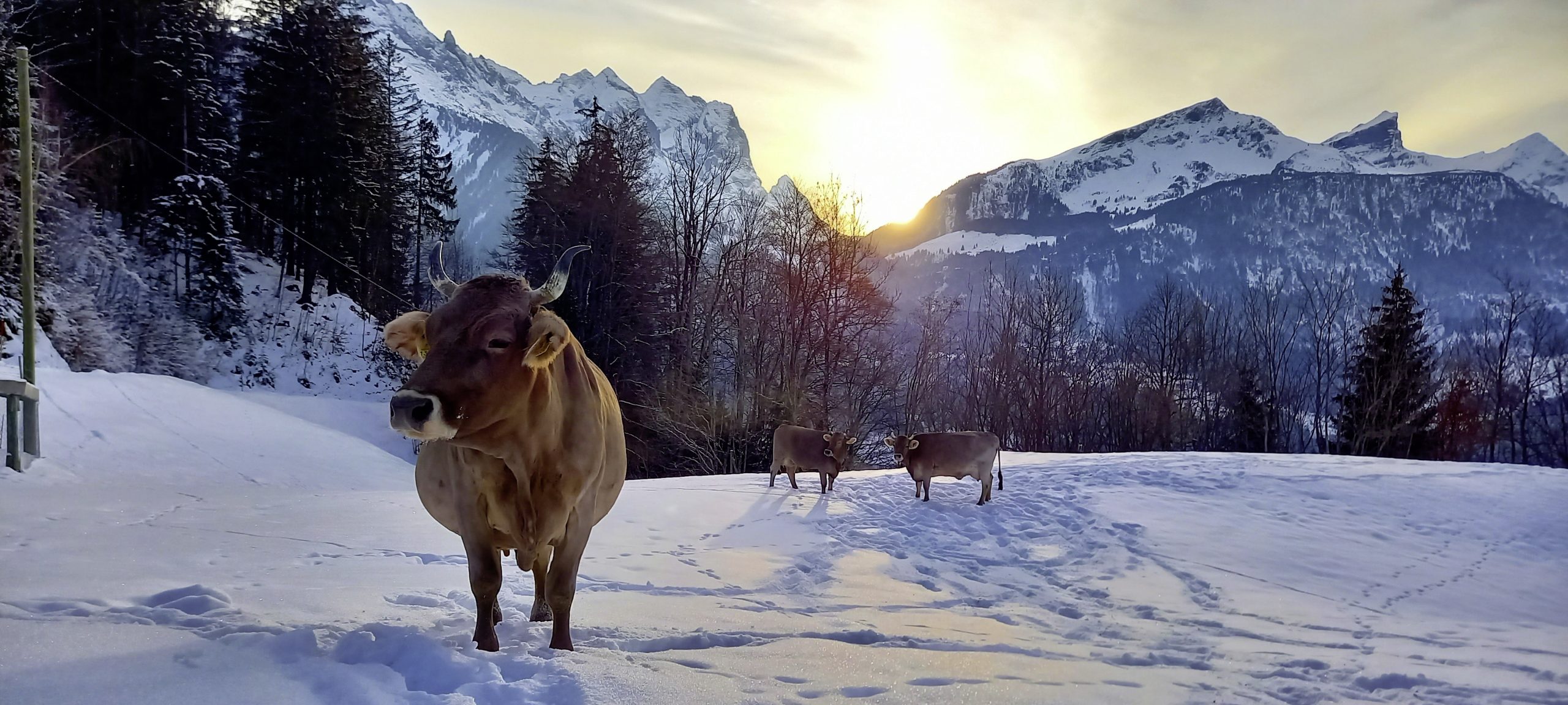 Auch wenn sich die Wahl ums Siegerbild bei dieser grossen Menge schwierig gestaltete, darf letztendlich Christina von Bergen aus Hasliberg Reuti triumphieren, herzlichen Glückwunsch zum Sieg! Die Kühe Lena, Bea und Veieli strahlen in der verschneiten Winterlandschaft bei Sonnenuntergang Ruhe, Harmonie und Zufriedenheit aus. Danke für all die tollen Wettbewerbsteilnahmen in dieser Woche.