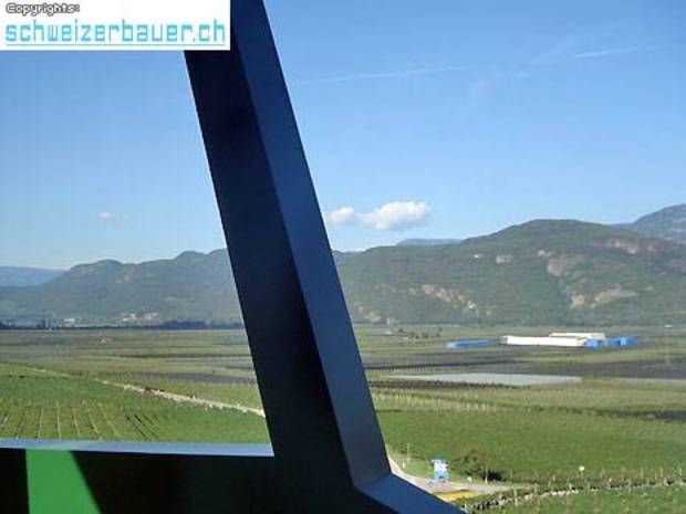 Ausblick aus dem Degustationssaal der Genossenschaftskelterei Tramin über Südtirols Süden.