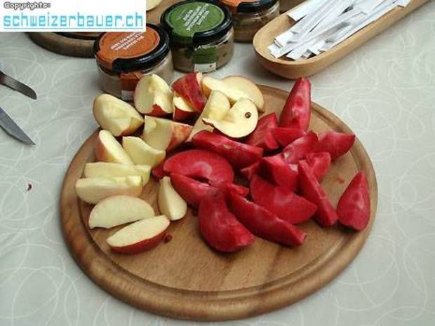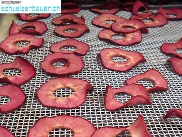 Allerlei Trockenfrüchte gehören zum Sortiment. Hier die rotfleischige Apfelsorte Weirouge.