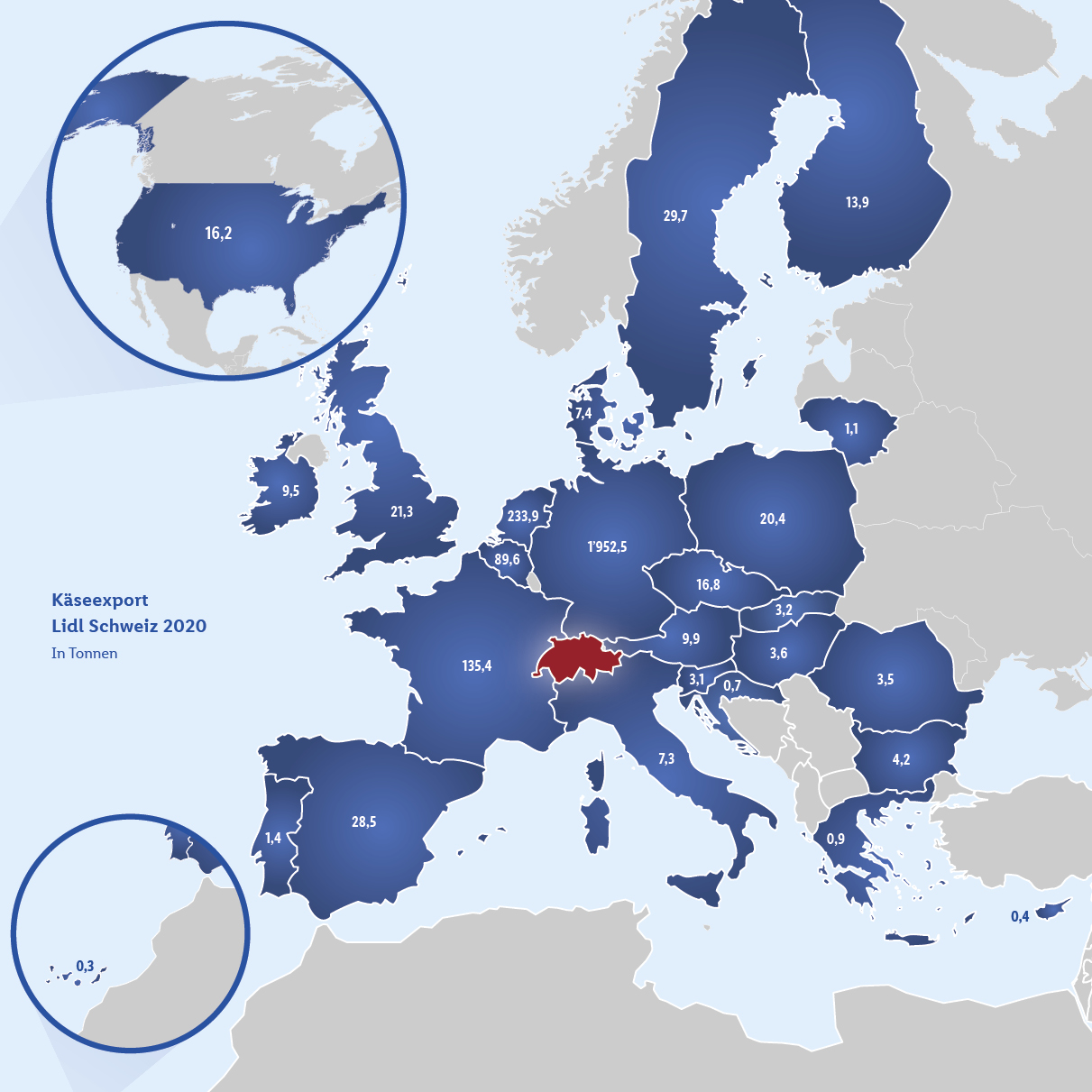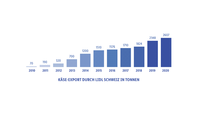 Lidl exportiert verschiedene Schweizer Produkte ins Ausland – zum grössten Teil Käse, der besonders in Deutschland Absatz findet. Auch letztes Jahr konnte Lidl Schweiz den Export von Käse steigern.