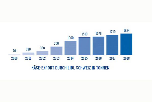 2018 steuerten die Käseexporte von Lidl bereits rund 2,5 Prozent zu den gesamten Käseexporten aus der Schweiz bei. Diese hatten im letzten Jahr um 1,4 Prozent auf 72'595 Tonnen zugenommen, wie TSM Treuhand Ende Januar gestützt auf die Zolldaten bekannt gegeben hatte.