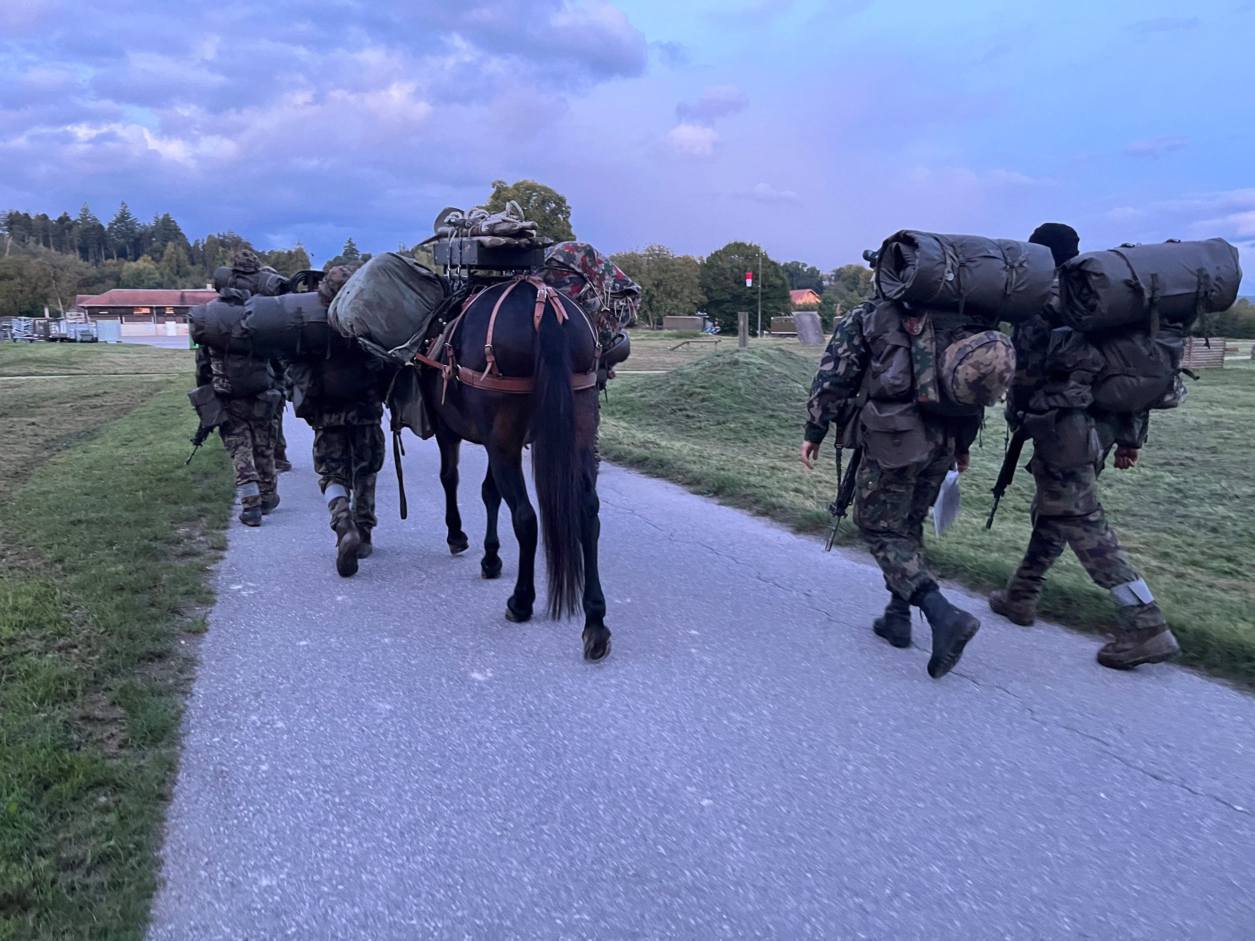 Eine Woche später fand eine grössere Übung statt, mit allen Funktionen vereint: Hundeführer, Veterinärsoldaten, Trainsoldaten/ Patrouillenreiter. Es ging darum, mit den Pferden und schwererer Packung eine festgelegte Route zu laufen, um dann an einem bestimmten Ort zu biwakieren. Das Biwakieren als solches war nichts Neues, mit den Pferden war es das erste Mal. Somit gab es nicht nur eine Feuer- sondern auch eine Pferdewache.