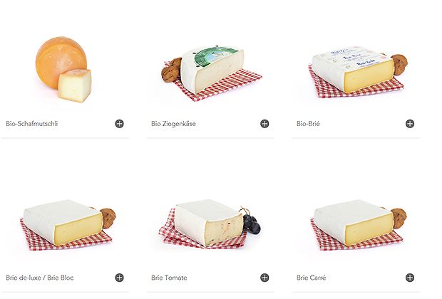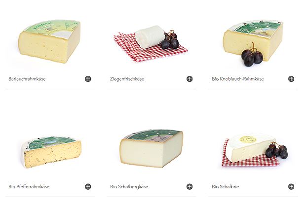 Bärlauch-Rahmkäse, Bio Knoblauch-Rahmkäse, Bio Pfeffer-Rahmkäse, Bio Schafbergkäse, Bio Schafbrie, Bio Schafmutschli, Bio Ziegenkäse, Bio Brie, Brie de-luxe/Brie Bloc, Brie Tomate, Brie Carré, Chnobli Chäs, Grottenkäse, Pfeffer-Rahmkäse «Don Pepe», Rauch-Chäsli, Steinerberger Bio Bergkäse, Steinerberger Mutschli, Steinerberger viertelfett, Tell Geisskäse, Ur-Schwyzer Bergkäse (Swiss Knife Valley), Urschwyzer halbfett, Urschwyzer Kräuterkäse, Wildspitz-Bergkäse, Wildspitzkäse Bio Rahm, Ziegenfrischkäse, Ziegenkäse A.X.V.