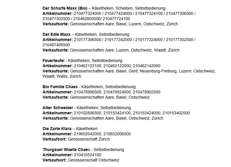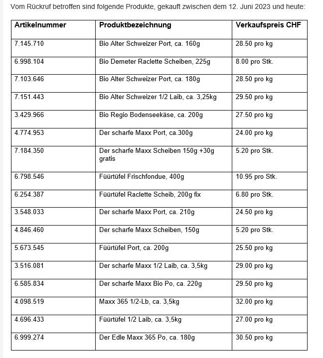 Beim Sortiment von Coop betrifft es die Käserei-Studer-Produkte «Bio Alter Schweizer», «Bio Demeter Raclette», «Bio Alter Schweizer», «Bio Regio Bodenseekäse», «Der Scharfe Maxx», «Maxx», «Der Edle Maxx» und «Füürtüfel». Nicht betroffen sind vor dem 12. Juni gekaufte Waren.