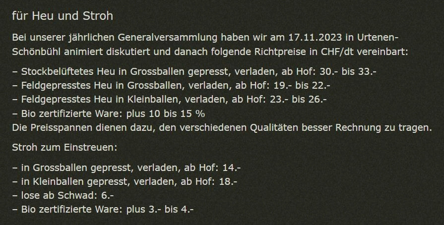 Wer verkauft für 33 Fr. belüftetes Heu? Da kann ich nur lachen! Wo bekommt man für so wenig Geld Heu her? Die Heupreise bewegen sich um die 50 Fr.. Dieser sogenannte Raufutterverband hat wohl feuchte Träume und hat keine Ahnung von den gezahlten Preisen!