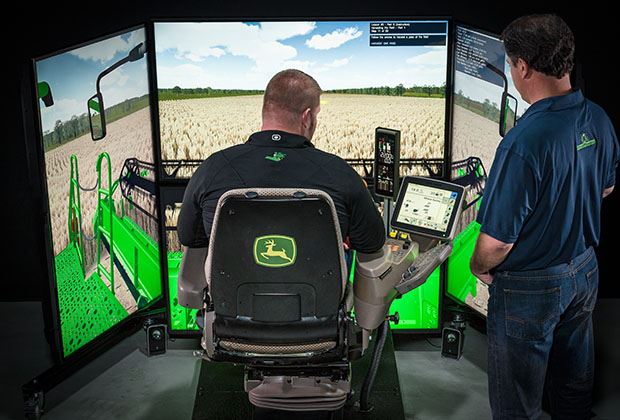 John Deere wird an der Grünen Woche in Berlin seinen neuen Mähdrescher-Simulator "GoHarvest" ausstellen. Die Simulation ermöglicht dem Fahrer eine realistische Darstellung der Getreideernte auf vier grossen Bildschirmen.