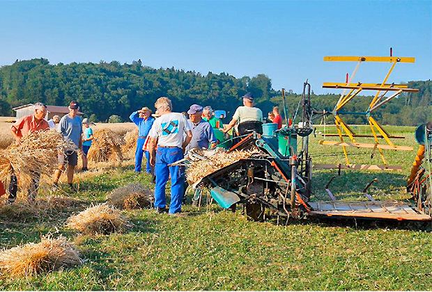 Eine echte Herausforderung für die Lieuse, den Fahr-Bindemäher aus den 1940er-Jahren mit Bodenantrieb und den 180er-Steyr mit Jahrgang 1950. Die Oldtimer gehören Werner Schwab und Sohn Roland Schwab. «Man weiss nie, wie lange wir das noch schaffen und man kann es der alten Maschine nicht verübeln, wenns ‹schoppet›», sagt Werner Schwab doppelbödig. Nach einigen Problemen mit Spannriemen, Antriebsrad, Fördertuch, Knoter und der Engelsgeduld von Roland Schwab tuckert das Gefährt übers Feld, mäht den Weizen, bindet die Garben und legt sie in schönen Reihen ab.