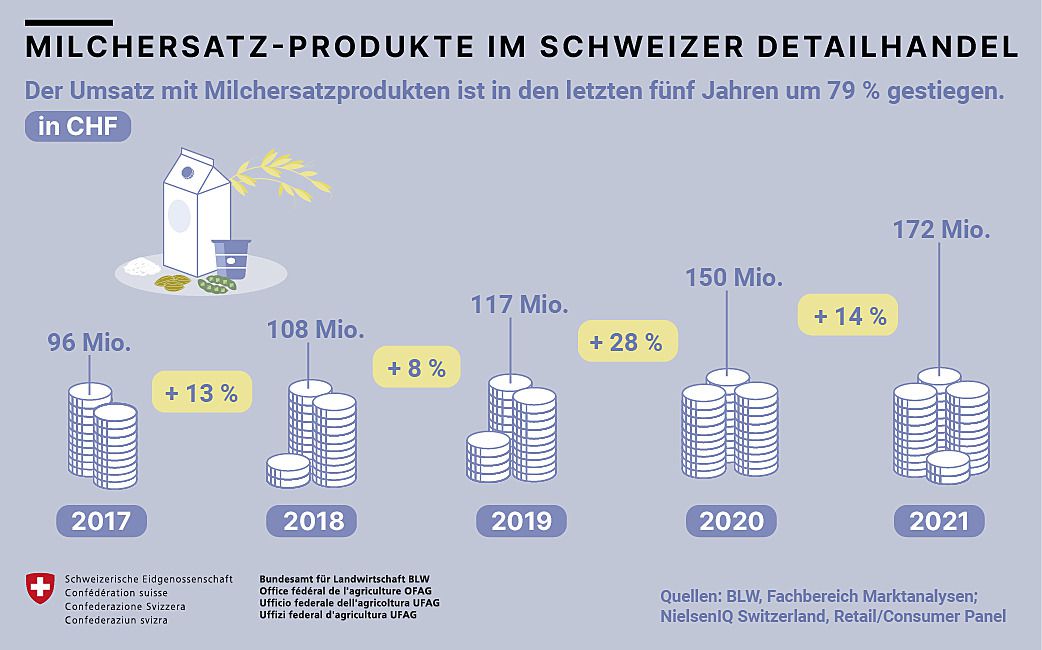 Auch das Bundesamt für Landwirtschaft (BLW) sieht für Pflanzendrinks Marktchancen. «Die steigende Nachfrage nach Lebensmitteln pflanzlicher Herkunft eröffnet der Schweizer Landwirtschaft Entwicklungsmöglichkeiten im Bereich der Ackerkulturen», heisst es in einem Marktbericht des BLW.