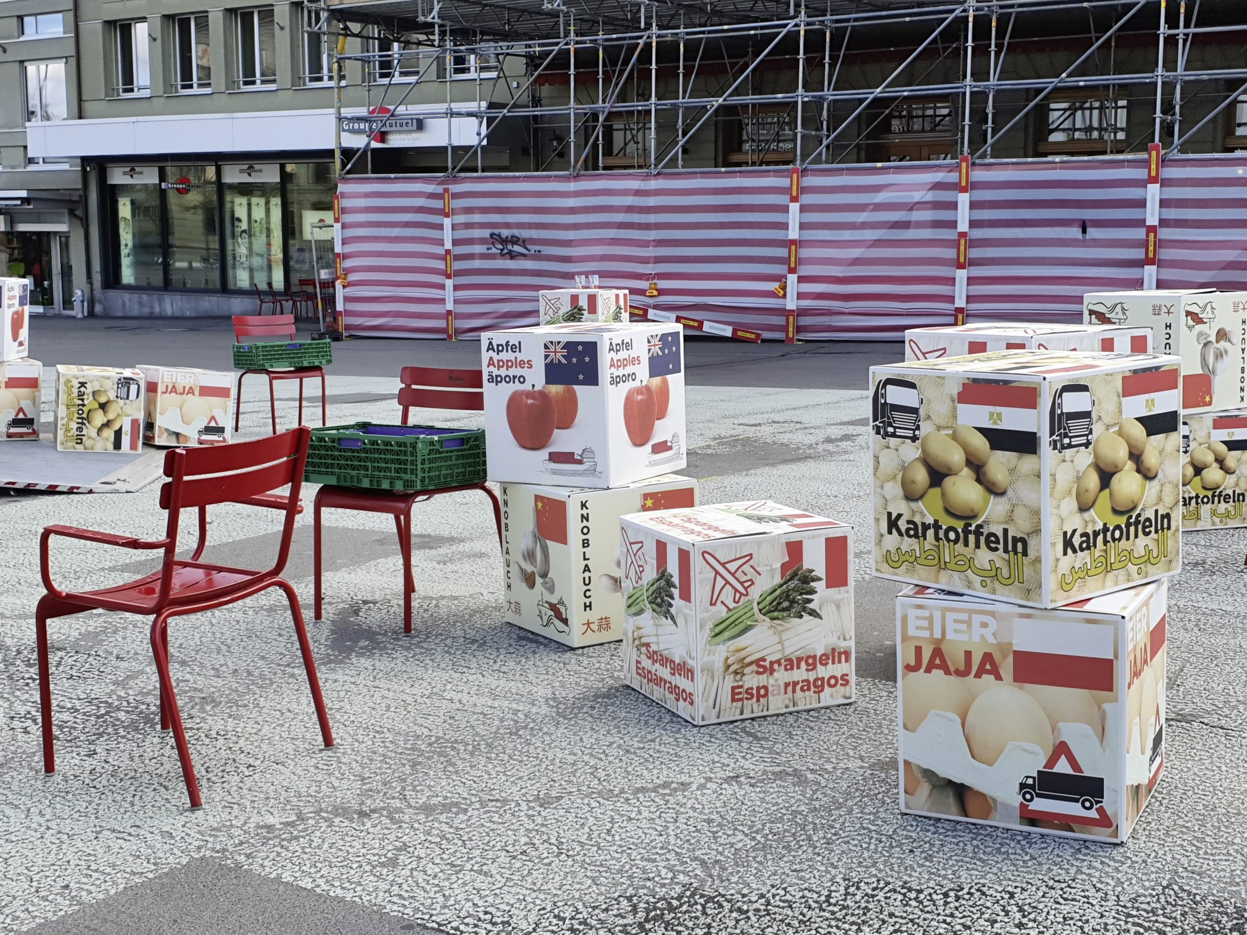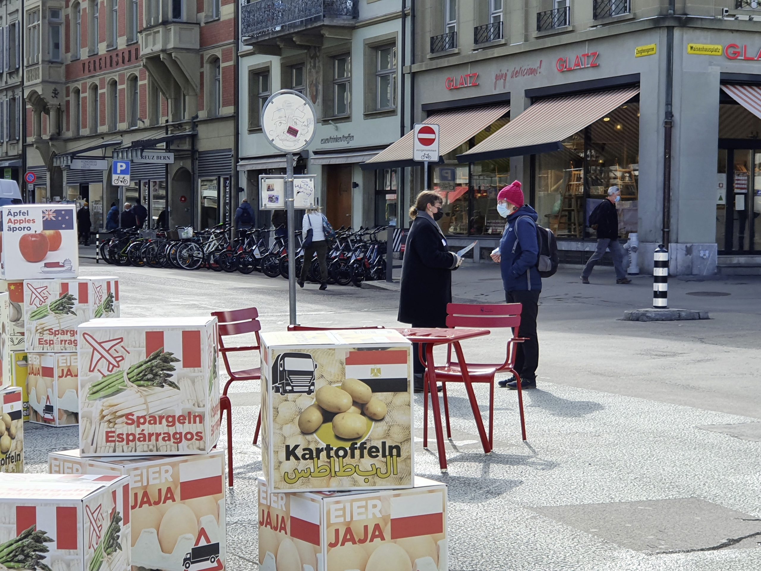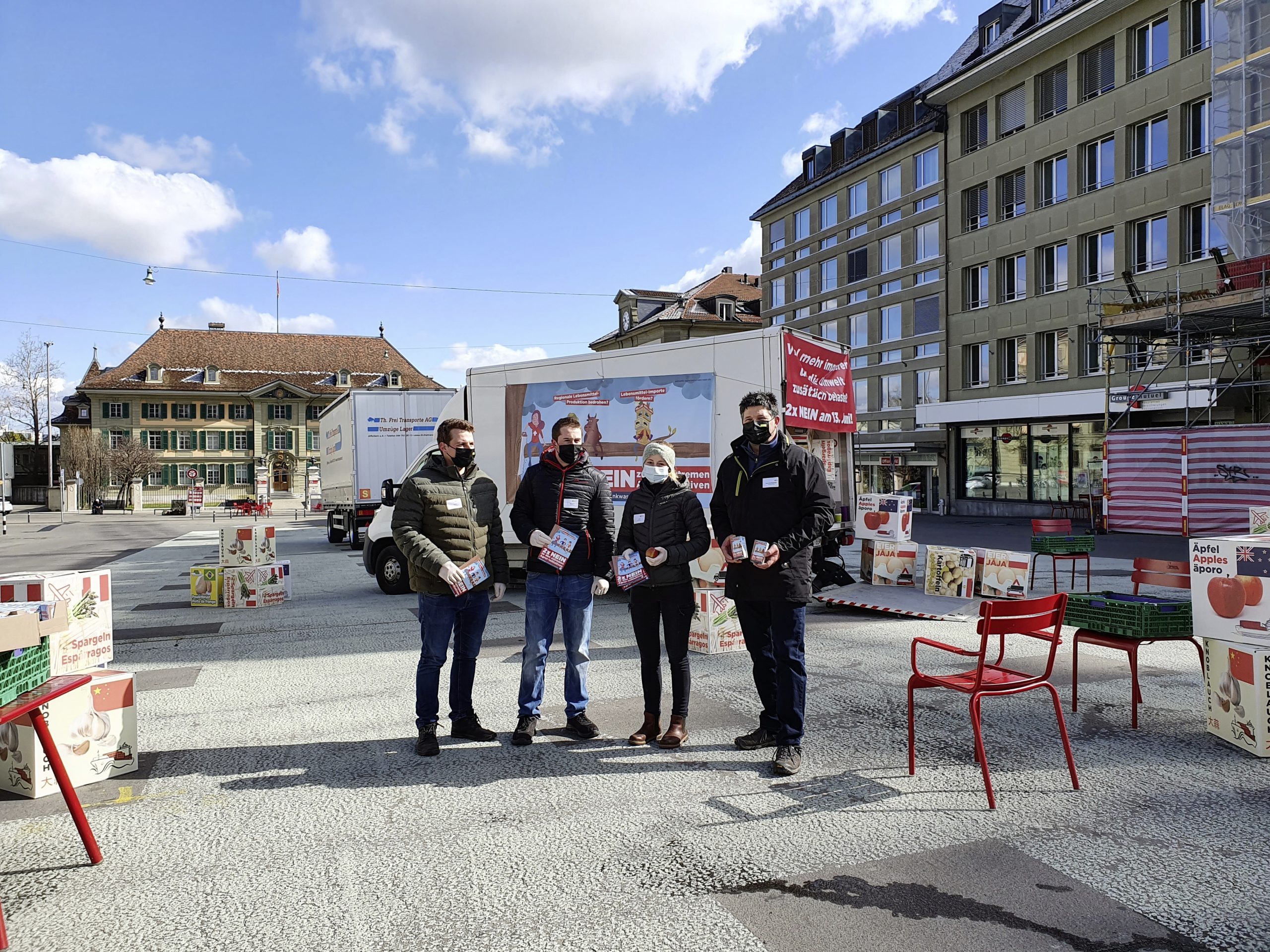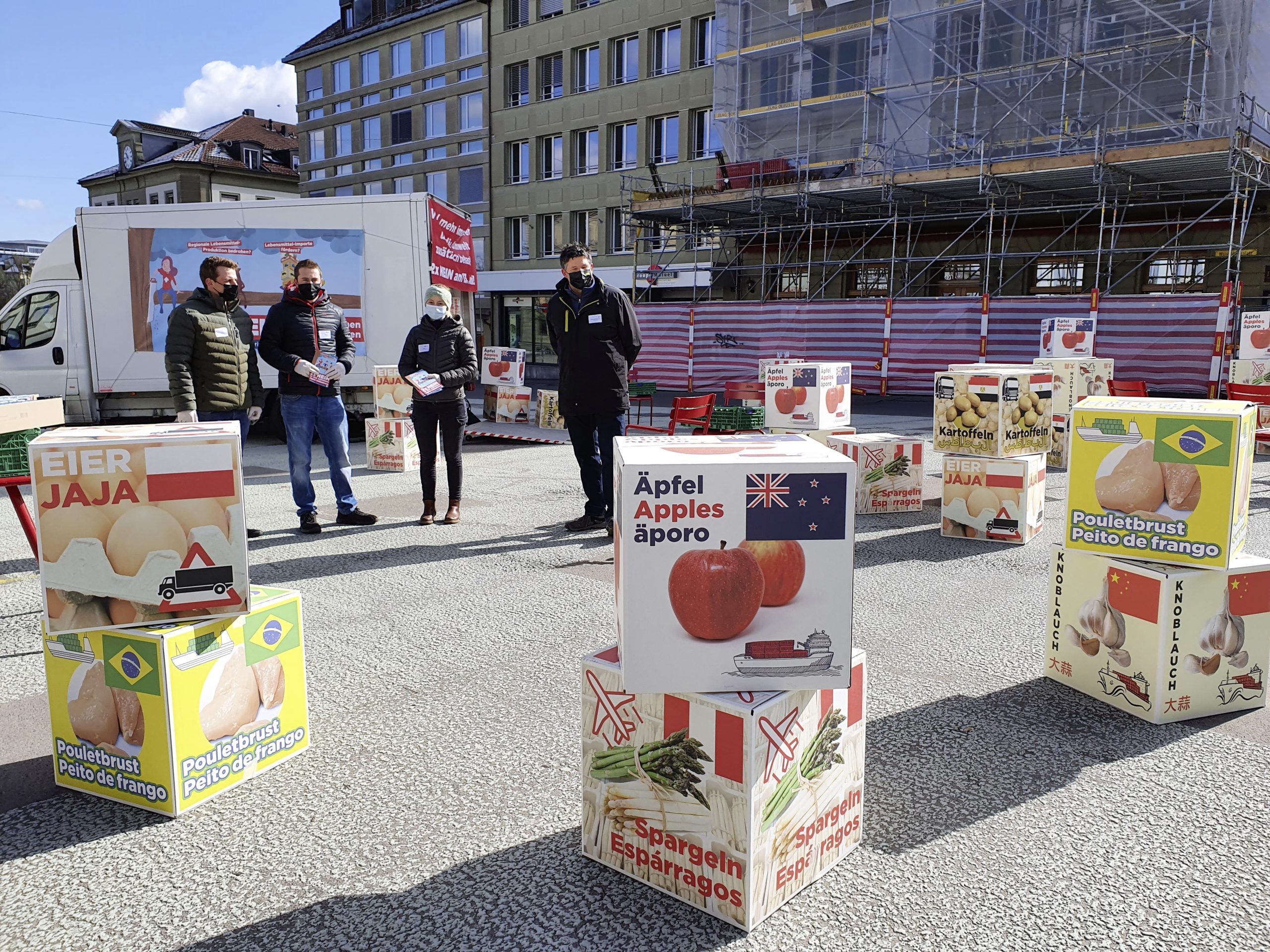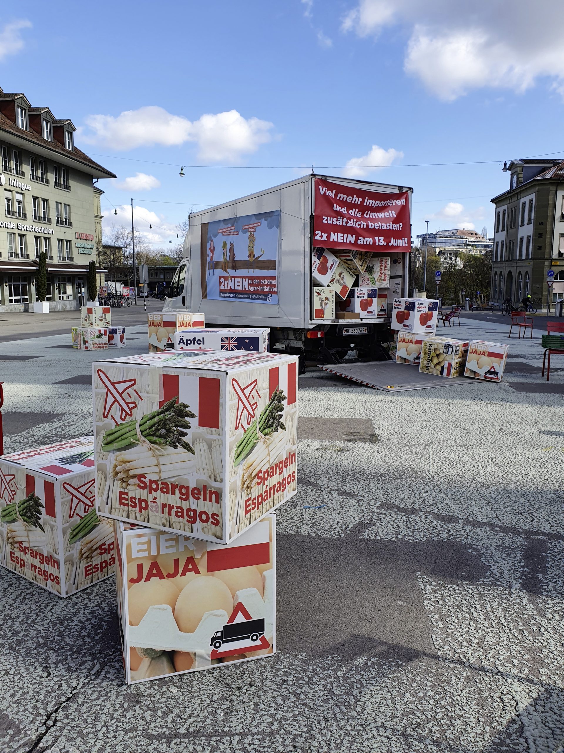 Spargeln aus Peru, Kartoffeln aus Ägypten oder Äpfel aus Neuseeland. Das blüht der Schweizer Bevölkerung gemäss dem Berner Bauernverband (BEBV) und den Junglandwirten nach Annahme der Trinkwasser- oder der Pestizidverbotsinitiative. Um ihrer Befürchtung Nachdruck zu verleihen, führten sie gestern Dienstag symbolisch massenweise Auslandprodukte auf den Berner Waisenhausplatz und suchten das Gespräch mit Passanten.