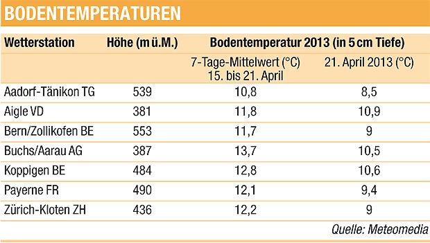 Die diesjährigen Bodentemperaturen lagen Anfang April bei 4 bis 7°C, die durchschnittlichen Abweichungen zum Vorjahr betrugen 3 bis 5°C. Die 8-°C-Grenze ist seit dem 11. April in den wichtigen Ackerbaugebieten der Schweiz überschritten worden.