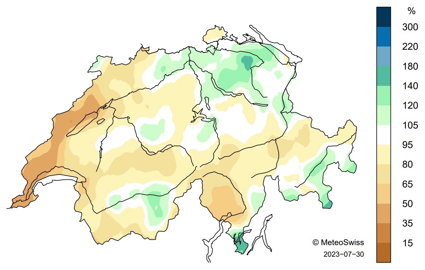 Die ersten beiden Monatsdrittel zeigten sich laut Meteoschweiz vorwiegend hochdruckbestimmt mit typisch sommerlichem Wetterverlauf. An vielen Tagen zogen Gewitter auf, die regional Regen, kräftige Böen und zum Teil auch Hagel brachten. In der Westschweiz seien die Regenmengen bis am 20. Juli lokal gering mit weniger als 20 Prozent der Monatsnorm gewesen. Die Alpensüdseite hingegen meldete Niederschläge in diesem Zeitraum von lokal 80 bis knapp über 100 Prozent der Norm.
