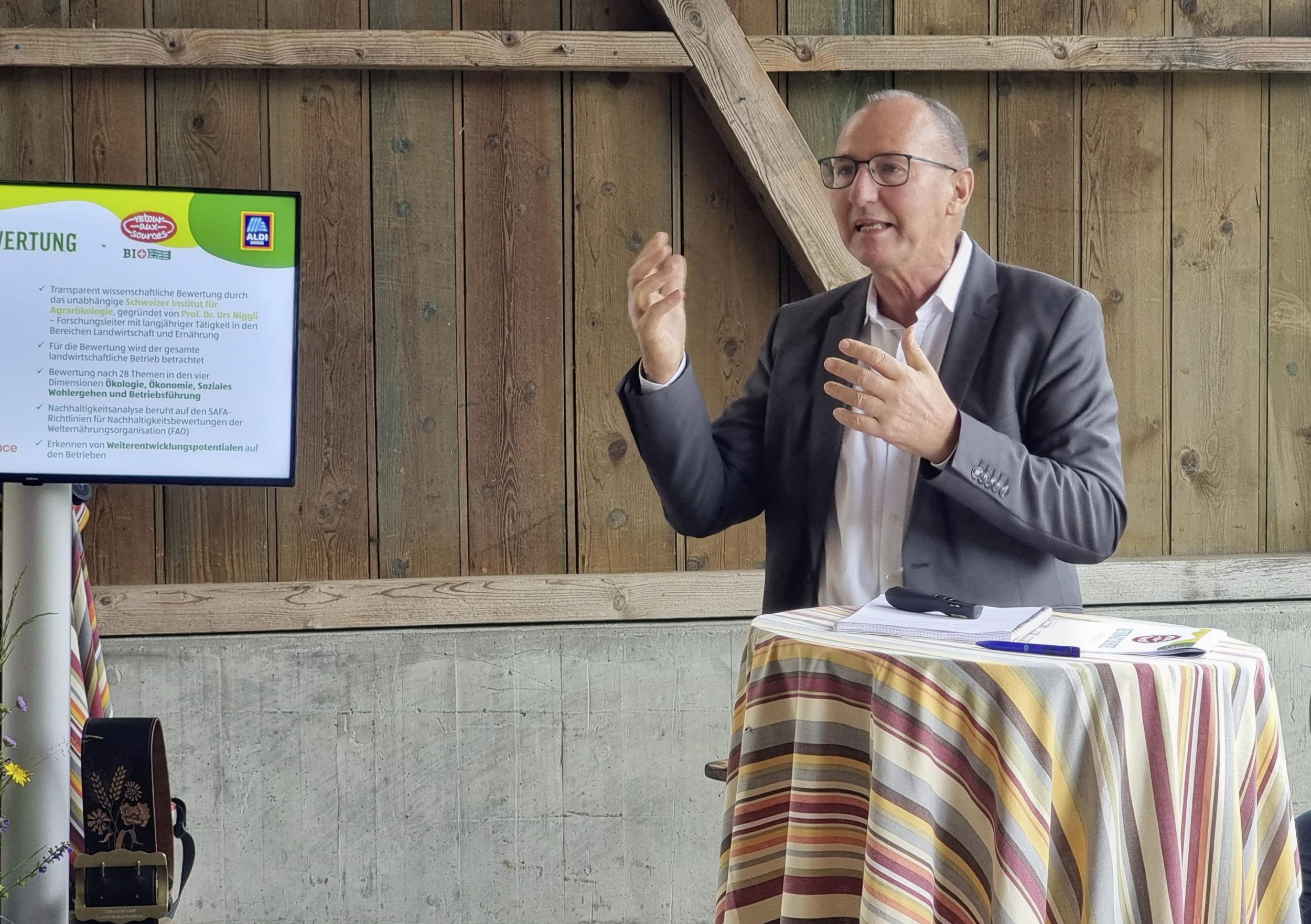 Er sei gefragt worden, wieso er mit Aldi zusammenarbeite, sagt Niggli: «Endlich können wir vieles, was wir Jahre lang am FiBL in Sachen Antibiotika-Reduktion, Biodiversität und anderen Bereichen erarbeitet haben, in der Praxis umsetzen», so Niggli. Was Aldi mache, sei eine beschleunigte Umsetzung jahrzehntelanger Forschung.