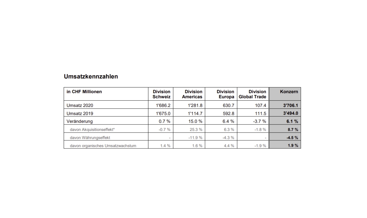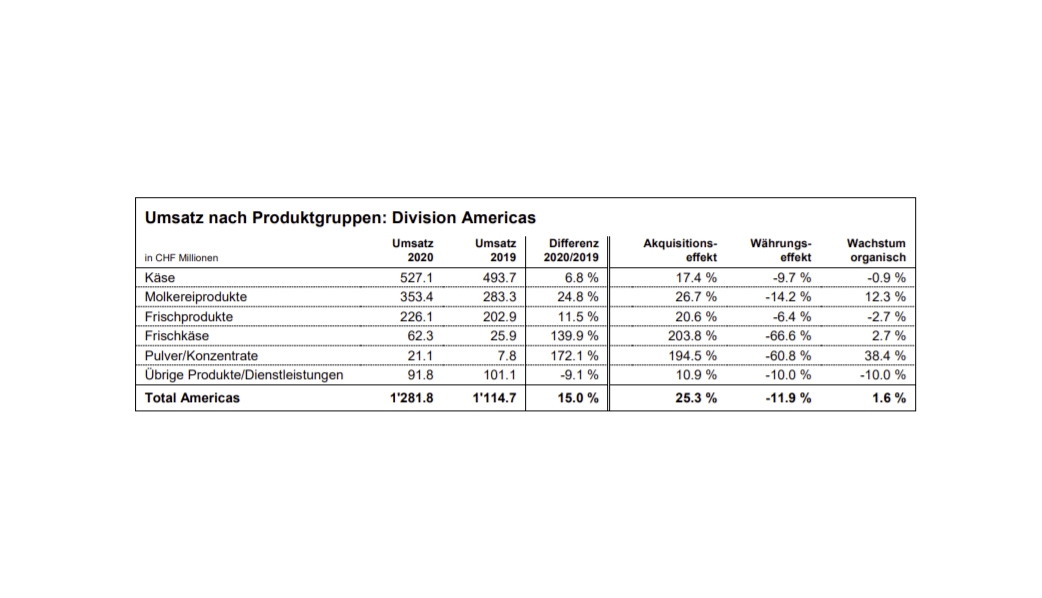 Das organische Wachstum der zweitgrössten Division Americas , welche die Märkte USA, Kanada, Mexiko, Chile, Tunesien, Spanien (ohne Lácteos Caprinos), Frankreich und Brasilien umfasst, lag bei 1,6 Prozent. Gewachsen ist die Division vor allem durch Übernahmen. Insgesamt resultierte ein Umsatz von 1,28 Mrd. Fr. Der Anteil von Americas am Konzernumsatz betrug 34.6 % (2019: 31.9 %).