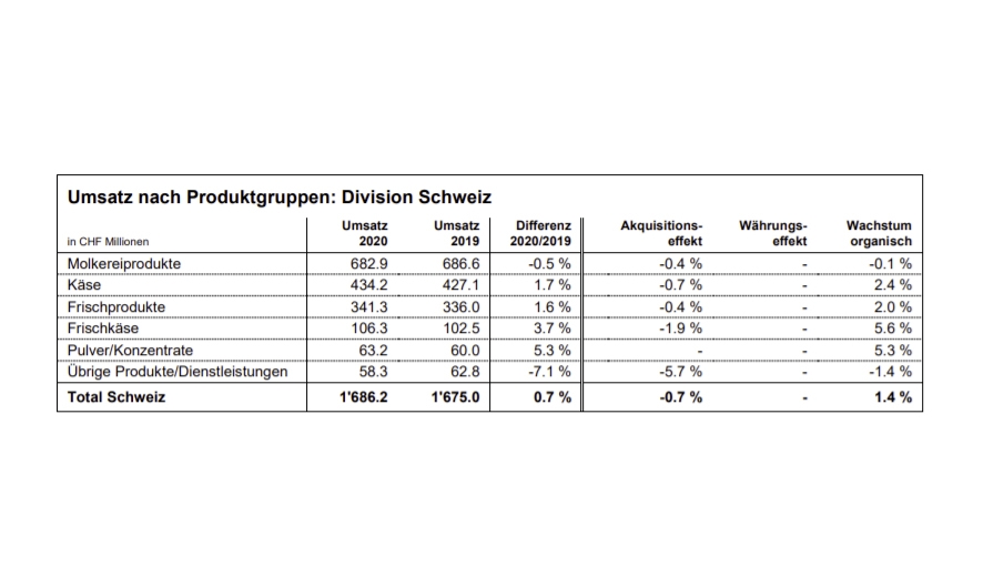 Chile und Tunesien waren Corona-bedingt hauptverantwortlich für die einerseits deutlich höhere Nachfrage nach Basisprodukten mit positiven Auswirkungen auf das Segment Molkereiprodukte (organisch: 12.3 %) und andererseits Einbussen im Segment Frischprodukte (organisch: -2.7 %). Im Segment Frischkäse (organisch: 2.7 %) konnte das Wachstum in Brasilien und bei Redwood Hill in Kalifornien die wiederum Corona-bedingten Einbussen beim Handelsgeschäft von Mexideli ausgleichen.