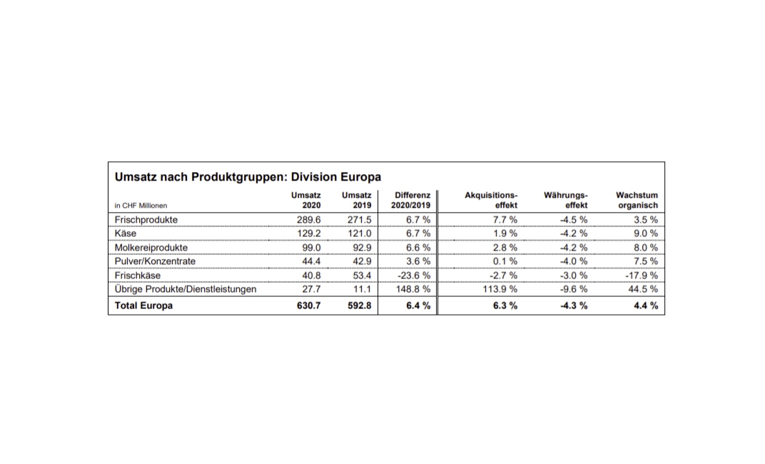 Die Division Europa erwirtschaftete 2020 einen Umsatz von 630.7 Mio. Fr. , das sind 6,4% mehr als im Vorjahr. Die Division mit den Märkten Italien, Deutschland, Österreich, Belgien, Niederlande, Grossbritannien und Lácteos Caprinos in Spanien erreicht damit einen Anteil am Konzernumsatz von 17% (2019: 17%).