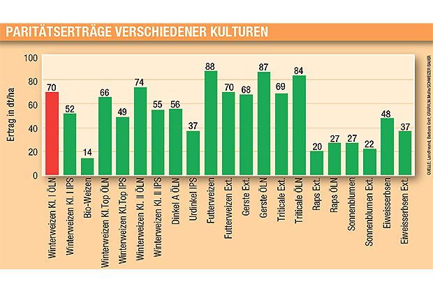Um den gleichen finanziellen Ertrag wie mit 70 dt/ha ÖLN-Winterweizen (Kl. 1) zu erzielen, müssen 88 dt/ha Futterweizen gedroschen werden oder 20 dt/ha Extenso-Raps oder 37 dt/ha Urdinkel IPS. Diese Paritätserträge wurden von Barbara Graf vom Bildungszentrum Wallierhof berechnet und im «Landfreund» publiziert. Als Datengrundlage dienten die Preise von 2013 und die Kosten aus dem Agridea-Deckungsbeitragskatalog 2012.
