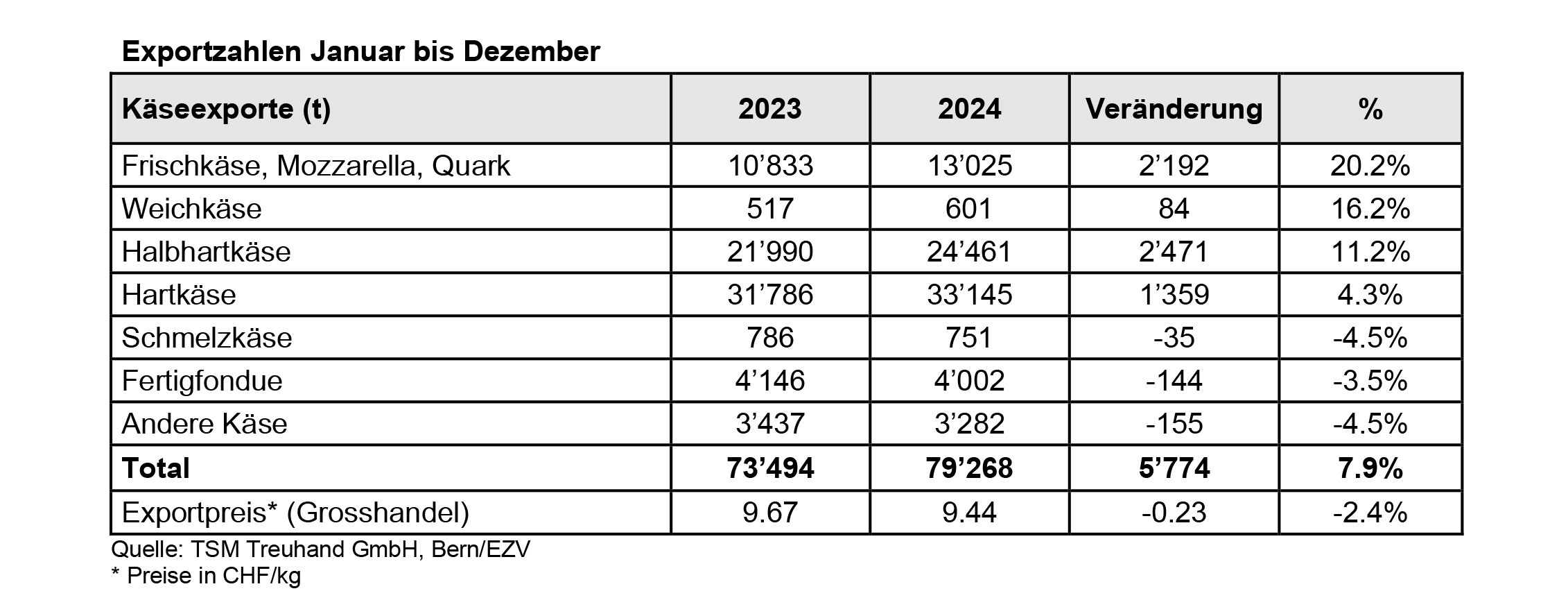 Exporte von Käse, Schmelzkäse und Fertigfondue von Januar bis Dezember 2024 im Vergleich zur Vorjahresperiode 2023 (t, Rundungsdifferenzen sind möglich).