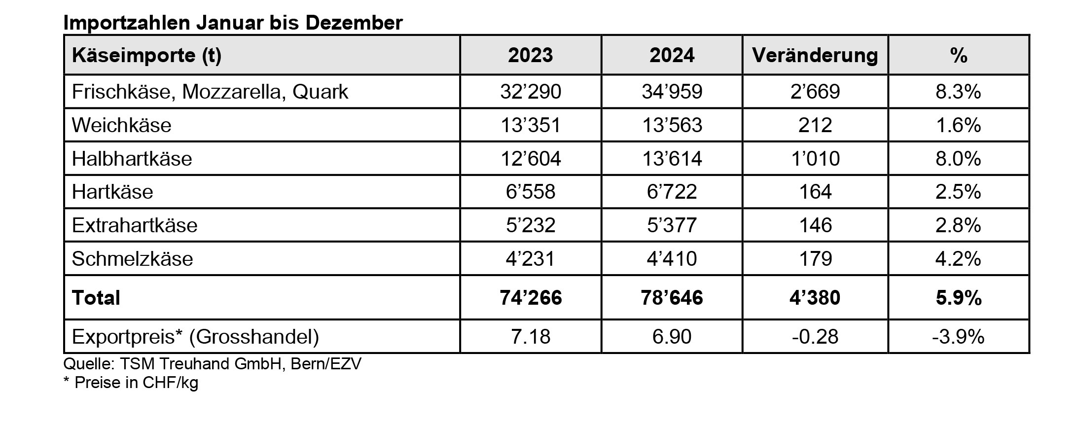 Bei den Einfuhren geht die Zunahme vor allem auf die Kategorie «Frischkäse und Quark» (+2’669t; +8,3%) und Halbhartkäse (1010t t; +8,0%) zurück. Beim Halbhartkäse (-703t; -5,3%) war hingegen ein deutlicher Rückgang zu verzeichnen. Der grösste Teil der Importe entfällt auf die Kategorie «Frischkäse und Quark», die mit 34’959 Tonnen 44,5 % der Gesamtimporte ausmacht.