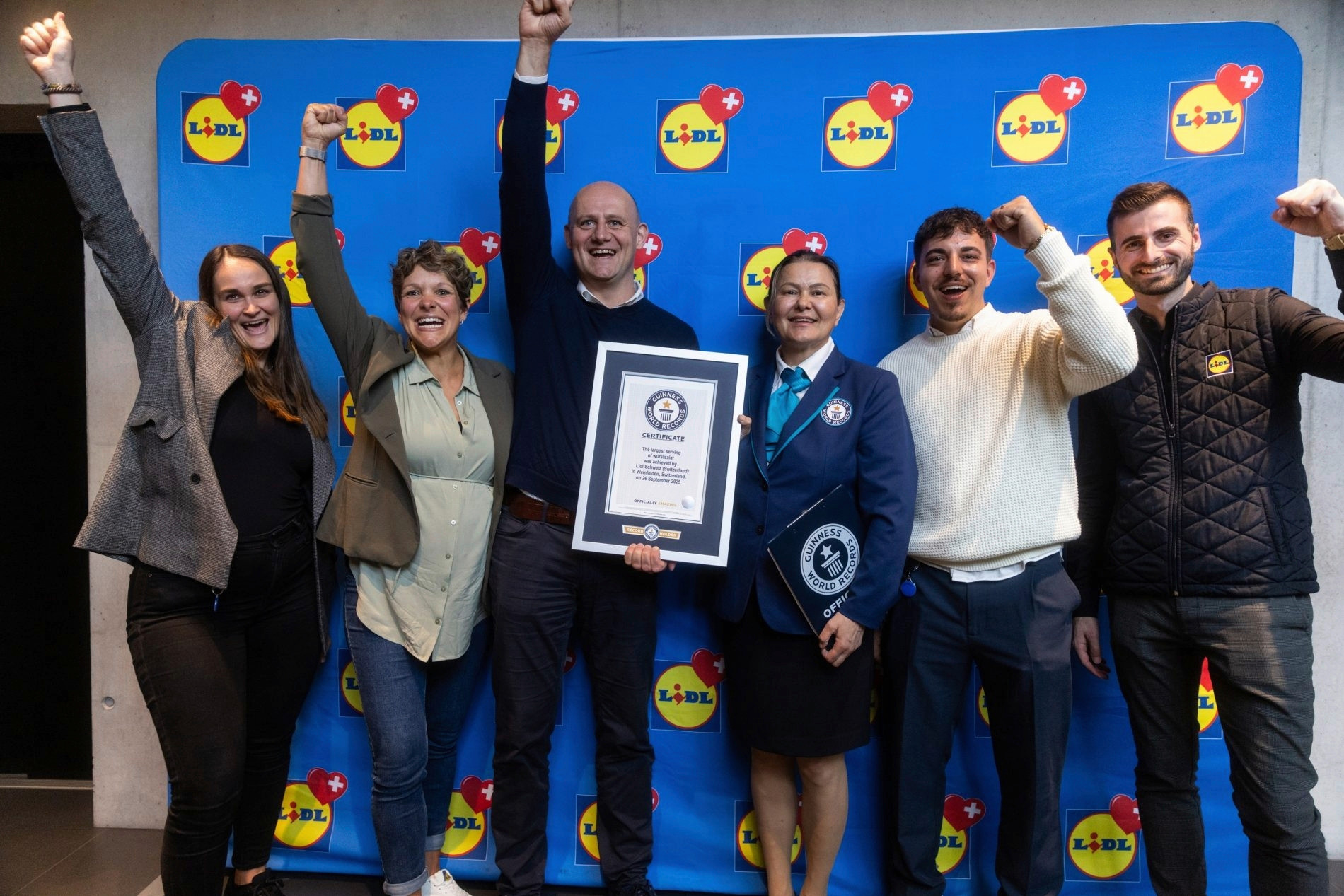 Der neue Rekord übertraf die Mindestvorgabe von Guinness World Records um 14,5 Kilo, wie der Detailhändler weiter schreibt. Nach der offiziellen Abnahme durch Guinness World Records verteilt Lidl Schweiz gratis über 2000 Portionen Wurst-Käse-Salat an der WEGA, der grössten Publikumsmesse des Kantons Thurgau.