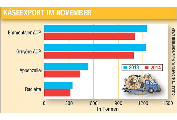 Im November 2014 wurde deutlich weniger Käse exportiert als im vergleichbaren Vorjahresmonat. Während im ganzen Monat November 2013 noch 7317t ins Ausland verkauft worden waren, sind es 2014 noch 6814 t gewesen.