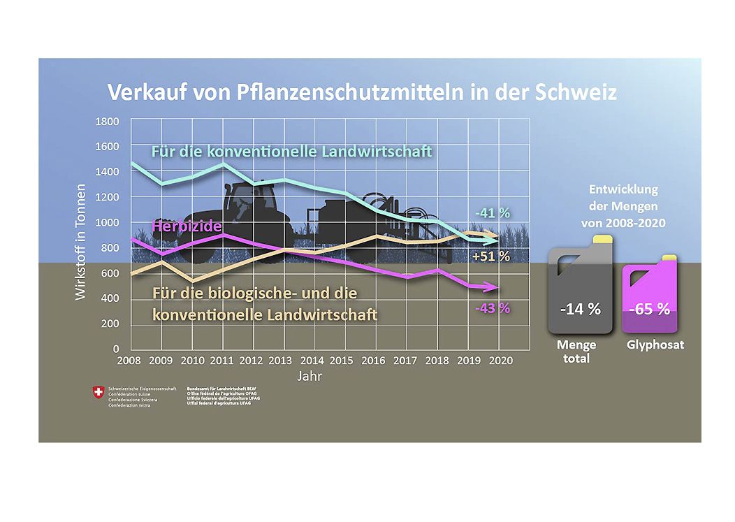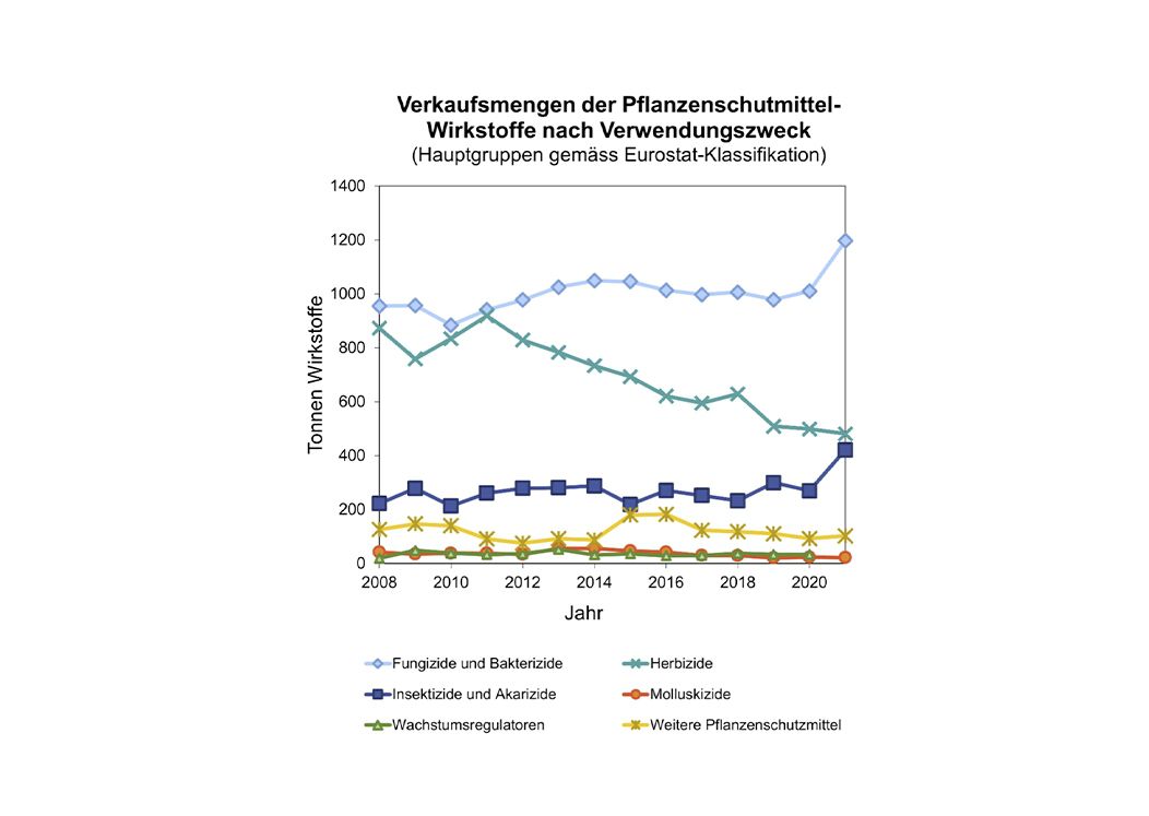 Bei den Herbiziden wurden 480 Tonnen verkauft, 18 Tonnen weniger als 2020. Der Absatz an Glyphosat ging wie bereits in den Vorjahren weiter zurück, er reduzierte sich um 14 Tonnen auf 105 Tonnen im Vergleich zum Vorjahr. 2008 waren davon noch 341 Tonnen verkauft worden.