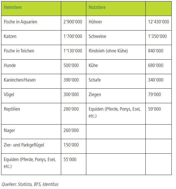 Während die Anzahl Heimtiere in der Schweiz laufend steigt, nehmen die Nutztierbestände seit Jahren ab. Heute hält fast die Hälfte der Haushalte (44%) in der Schweiz eines oder mehrere Haustiere. 3,8 Mio. Heimtierbesitzer stehen noch 42'000 Nutztierhalter gegenüber. Inzwischen hat es mehr Katzen als Schweine in der Schweiz und mehr Haushunde als Schafe. Zurzeit sind knapp 50% der Equiden (pferdeartige) in der Schweiz als Heimtier eingetragen.