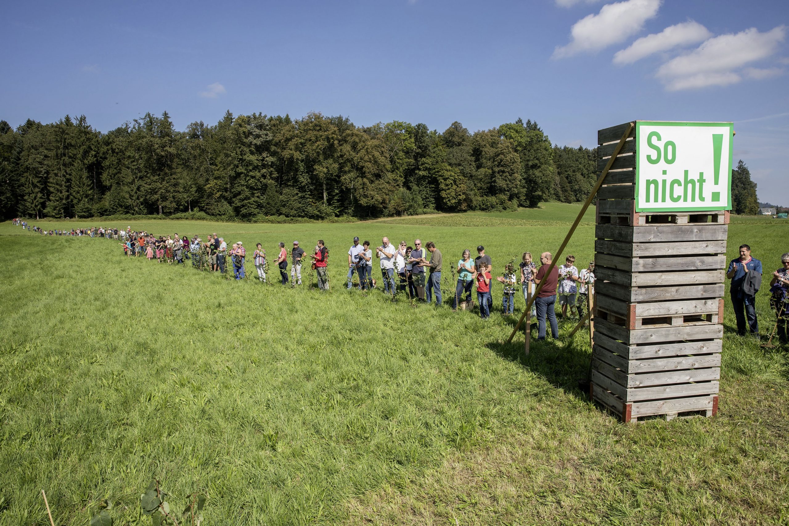 Nach Gründungsveranstaltung demonstrierte der Verein sodann seine breite Abstützung in der Region. Gut 200 Personen formierten sich zu einer Menschenkette, die den geplanten Verlauf der Strasse inmitten von Kulturland und einem Naturschutzgebiet sichtbar machte, heisst es in einer Mitteilung.