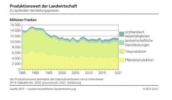 Gemäss dem BFS dürfte sich die Gesamtproduktion der Schweizer Landwirtschaft in diesem Jahr auf 11,2 Milliarden Franken belaufen. Das ist ein Minus von 2,1 Prozent gegenüber dem Vorjahr. Die Ausgaben für Vorleistungen (Futtermittel, Energie, Dünger, Unterhalt und Reparaturen usw.) betragen 7,0 Milliarden Franken und sind um 0,7% höher als im Vorjahr.