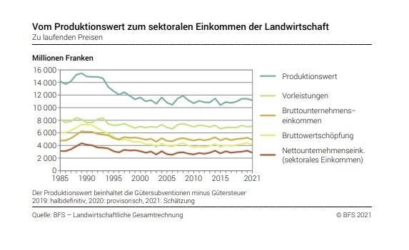 Das entspricht gegenüber 2020 einem Minus von 10,1 Prozent oder 321 Millionen Franken. Dieses Einkommen, das hauptsächlich die Arbeit und das produktive Vermögen (Kapital und Boden) sämtlicher Bauernfamilien in der Schweiz entschädigt, liegt damit nahezu 5,4% unter dem Durchschnitt der letzten fünf Jahre.