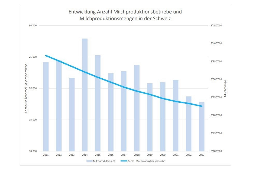 Es zeigt einen massiven Strukturwandel. 2003 gab es in der Schweiz noch über 30'000 Milchbauern. Sieben Jahre später, 2010, waren es noch 26'097 Betriebe (-6900). 2015 sank die Anzahl Milchbauern auf 21’765 Einheiten (-5’251). 2020 wurden nur noch 18'396 Milcherzeuger gezählt . 2023 gab es noch 17'164 Milchviehbetriebe (-439 gegenüber 2022). Damit haben 2023 jeden Tag 1,2 Milchproduzenten (2022: 0,88 Betriebe; 2021: 1,3 Betriebe) aufgegeben. Innerhalb 20 Jahren hat rund die Hälfte der Milchviehbetriebe aufgegeben.