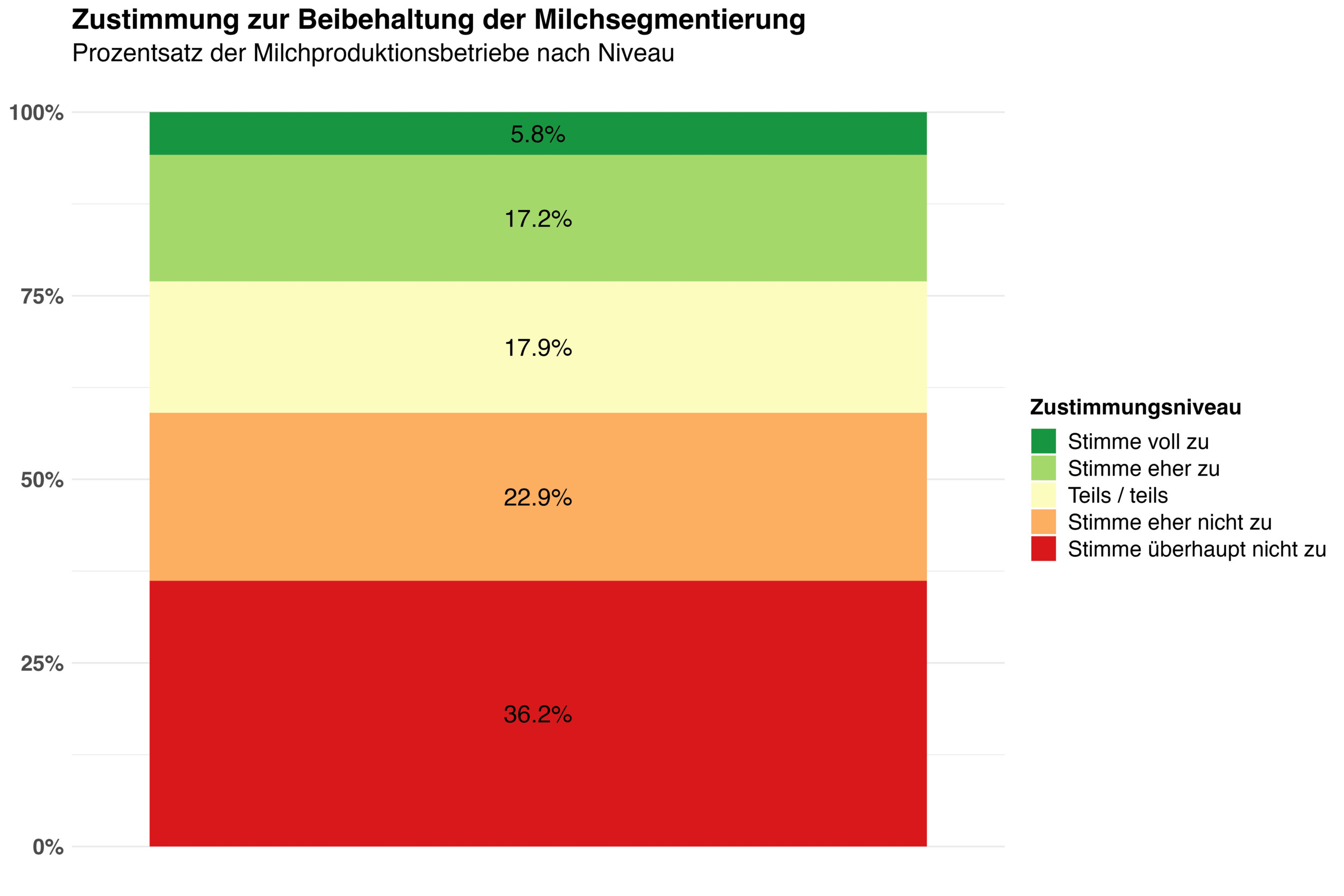 Befragt wurden die Produzenten auch zur Milchsegmentierung. Diese wurde 2011 eingeführt und umfasst die Segmente A, B und C. Dieses System wird von vielen Milchbauern negativ beurteilt. Knapp 60 Prozent die Segmentierung eher oder ganz ab, weil sie die Einteilung als intransparent und ungerecht empfinden. Die Ablehnung in der Westschweiz fällt am vehementesten ausfällt. «Die Bauern sehen die Segmentierung als Instrument, um Milch zu Gunsten des Verarbeitungssektors und Handels zu verbilligen und äussern Bedenken punkto der ungleichen Marktmachtverhältnisse», sagt Bettina Scharrer. Als Alternative schlagen die Bauern unter anderem einen Einheitspreis mit Abstufungen nach Qualität vor, die Freiwilligkeit der Lieferung ins B-Segment oder die Nutzung des B-Milch-Segments im Falle von Überschreiten im Lieferrecht festgelegter Mengen.