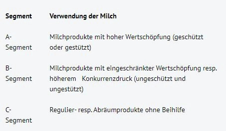 Der Richtpreis für A-Milch wird mithilfe des Molkereimilchpreisindex (BLW) und der prospektiven Markteinschätzung des Vorstandes der BOM quartalsweise festgelegt. Der Richtpreis im B-Segment entspricht dem Rohstoffwert eines Kilogramms Milch bei der Verwertung zu Magermilchpulver für den Weltmarkt und Butter für den Inlandmarkt. Der Richtpreis im C-Segment entspricht dem Rohstoffwert eines Kilogramms Milch bei der Verwertung zu Magermilchpulver und Butter für den Weltmarkt.