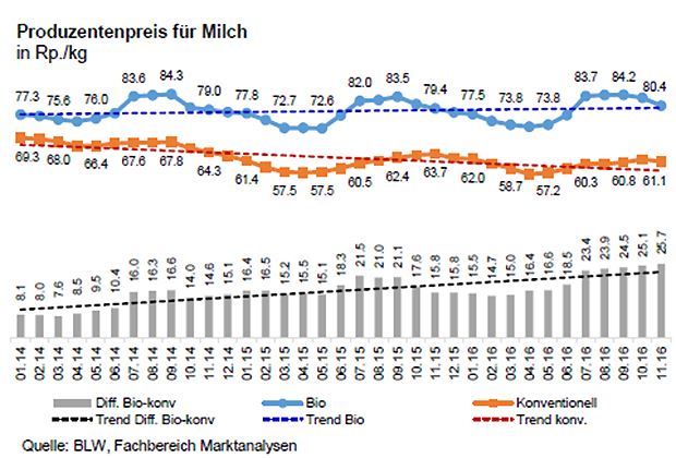 Bei der konventionellen Milch ist im Gegensatz zur Biomilch die Preistendenz sinkend. Lag der Preis im Mai 2014 noch bei 66 Rp./kg, so sank dieser in den Folgejahren auf 57 Rp./kg. Die Preise sind also deutlich gefallen. Die Preisspanne zwischen der konventionellen Milch und der Biomilch erhöhte sich in der Folge deutlich, und zwar von 14,6 Rp./kg im November 2014 auf 25,7 Rp./kg im November 2016 (höchster Wert im Berichtszeitraum).