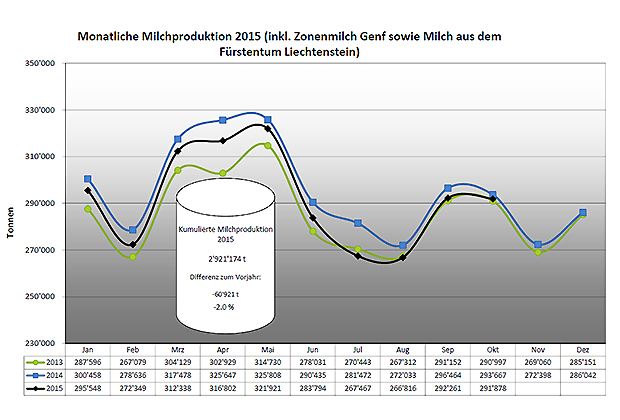 Die Bauern liefertenn auch im Oktober weniger Milch ein als im Vorjahresmonat. Dies geht aus dem jüngsten Bericht der TSM Treuhand GmbH hervor. Die Produktion lag bei 291‘878 Tonnen, das waren 0,6 Prozent oder 1‘789 Tonnen weniger als im Oktober 2014. Die kumulierte Produktion in den ersten zehn Monaten dieses Jahres lag 2 Prozent unter der Vorjahresperiode. Von Januar bis Oktober wurden 2‘921‘174 Tonnen Milch eingeliefert, das sind 60‘921 Tonnen weniger als 2014.