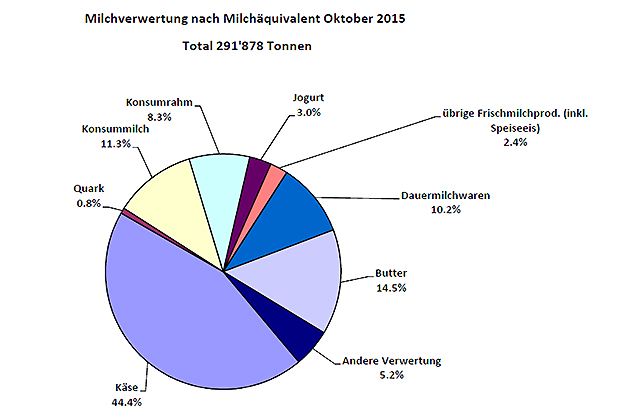 Rund 44 Prozent der eingelieferten Milch im Oktober 2015 wurde zu Käse verarbeitet. Eine steigende Produktion wurde unter anderem beim Quark (+15,1% auf 2‘193 t) sowie beim Posten „übrige Verwertung“ (+22% auf 15‘178 t) beobachtet.