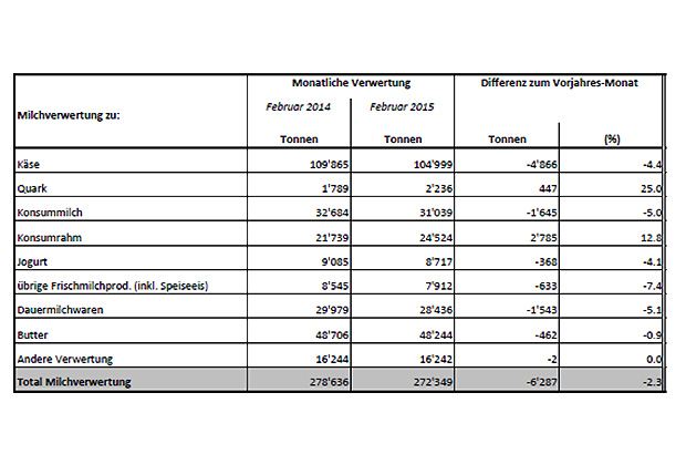 Wird die Milchverwertung (nach Milchäquivalent) im Februar 2015 betrachtet, ist vor allem der deutliche Rückgang bei der Käseproduktion auffällig. Die Produktion lag bei 104‘999 Tonnen, das sind 4‘866 Tonnen oder 4,4 Prozent weniger als im Februar 2014. Von der gesamten Milchmenge im Februar 2015 wurde 38,6 Prozent zu Käse verarbeitet. In den ersten beiden Monaten des Jahres 2015 sank die Produktion im Vergleich zu 2014 um 3 Prozent oder 6'800 Tonnen.