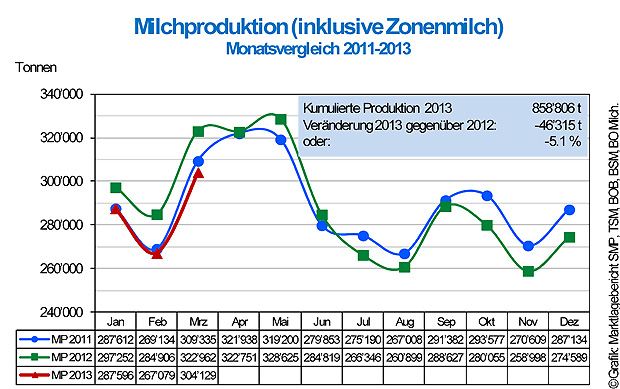 Und dieser Negativtrend setzt sich unvermindert fort. Im März wurden 304'129 Tonnen Milch produziert. Gegenüber März 2012 bedeutet dies einen Rückgang von 18'883 Tonnen oder 5,8 Prozent, wie es im jüngsten Marktlagebericht der Schweizer Milchproduzenten (SMP), der Branchenorganisation Milch (BOM) und der TSM heisst. Auch im Vergleich zu März 2011 wurden 1,7 Prozent weniger produziert. Im ersten Quartal 2013 wurden somit insgesamt 858'806 Tonnen Milch produziert. Das sind 5,1 Prozent oder 46'315 Tonnen als im 1. Quartal 2012 und 0,8 Prozent (7'275 Tonnen) weniger als im 1. Quartal 2011.