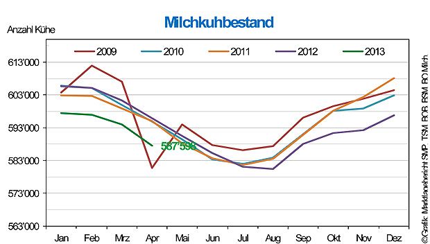 Wie bereits im Januar, Februar und März bildete sich der Kuhbestand auch im April 2013 saisonal zurück. Aber im Vergleich zu 2012 reduzierte sich der Bestand um 8'300 auf 587'598 Milchkühe (-1,4 Prozent). Der Tierbestand der Alterskategorie „2-3“ und „3-4“ Jahre liegt 2.8 respektive 4 Prozent unter den Vorjahreszahlen. Bei den älteren Kühen sind die Bestände hingegen leicht höher (2,2 bis 2,6%) als 2012.