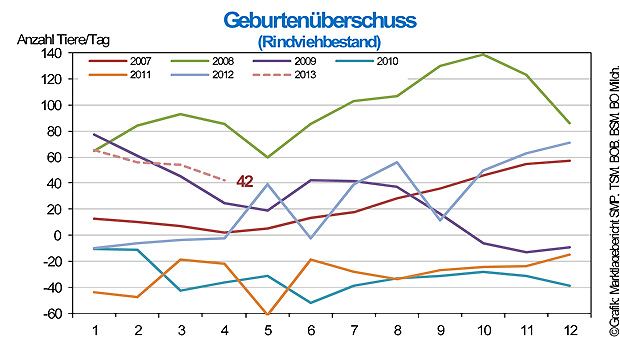 Der Geburtenüberschuss beim Rindvieh ist im April 2013 im Vergleich zum Vormonat (+54 Tiere/Tag) leicht gesunken, dieser liegt aber immer noch deutlich im positiven Bereich (+42 Tiere/Tag). Im April 2013 wurden rund 3,2 Prozent weniger Kälber geboren als im Vorjahresmonat. Die kumulierten Kälbergeburten (12 Monate) liegen 1,9 Prozent unter Vorjahr, heisst es weiter im Bericht.