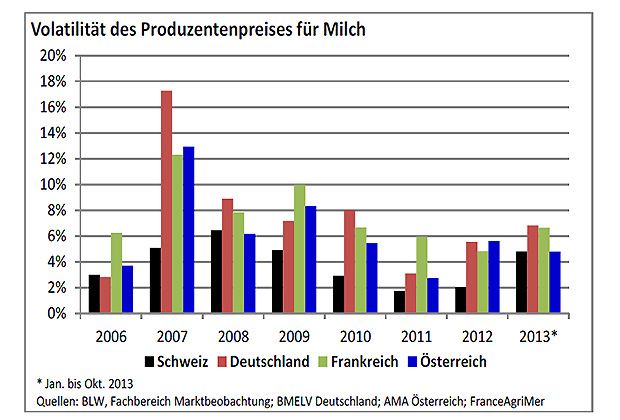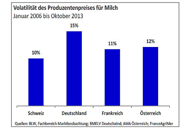 Wird die Volatilität mittels Abweichungen vom Mittelwert zwischen Januar 2006 und Oktober 2013 beobachtet (nicht annualisiert), sind die Schwankungen in Deutschland am stärksten. Der Schweizer Milchmarkt werde jedoch immer mit stärkeren Schwankungen des Produzentenpreises konfrontiert, heisst es im Bericht.