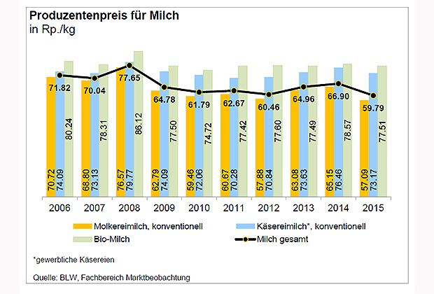 Das Jahr 2015 geht als sehr schlechtes Jahr in die Geschichte der Schweizer Milchproduzenten ein. Dies bestätigt sich nun auch die Statistik. Der durchschnittliche gesamtschweizerische Produzentenpreis für Milch ist im vergangenen Jahr im Vergleich zu 2014 um 10,6 Prozent (7,1 Rp/kg) auf 59,79 Rp./kg gesunken.