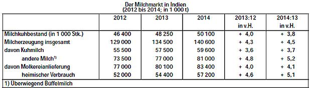Der weltweit grösste Erzeuger von Milch, Indien, wird 2014 voraussichtlich einen neuen Produktionsrekord erzielen. Laut Prognose des US-Landwirtschaftsministeriums könnte die Produktion von Kuh- und Büffelmilch auf dem Subkontinent im kommenden Jahr erstmals etwas oberhalb der Marke von 140 Mio. t liegen und damit gut 6 Mio. t oder 4,5 % höher als 2013 ausfallen.