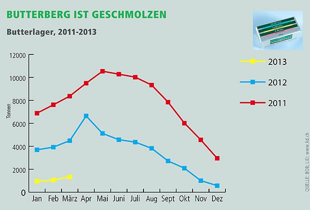 Als Folge des knapperen Milchangebots wurden rund 20% weniger Milchpulver und Butter produziert. Entsprechend ist auch der Butterberg der Vorjahre geschmolzen. Im März 2013 lagen gerade noch 1334 Tonnen Butter an Lager, 70% weniger als im gleichen Vorjahresmonat. Im ersten Quartal 2013 wurden lediglich 866 Tonnen exportiert, 75% weniger als in der gleichen Vorjahresperiode.