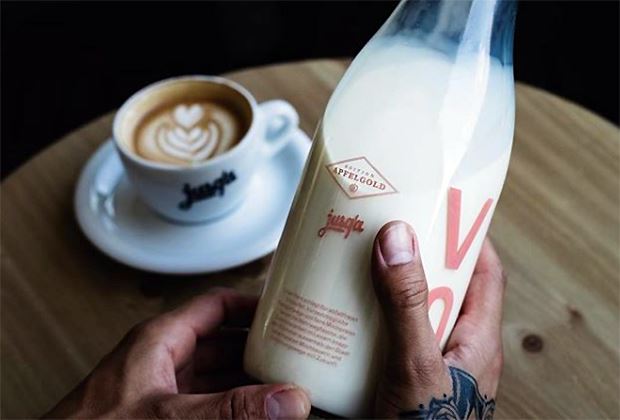 Wer Kaffee verkauft, verkauft auch Milch. Affolter hat sich deshalb Gedanken zu diesem Rohstoff gemacht. Zusammen mit Donat Berger, der das Café Apfelgold in Bern führt, hatte er die Idee eines Milchvertriebs. «Durch die Milch sollte möglichst wenig Abfall anfallen, sie sollte aus der Region sein und dem Produzenten einen fairen Preis bringen», sagt Affolter.